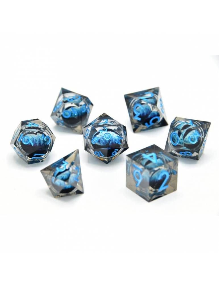 Dados de resina con ojo flotante: fabricados con resina de primera calidad, estos dados están moldeados a mano y tienen bordes afilados. En su interior, tienen un núcleo líquido con un ojo flotante. Juego completo de 7 dados: este juego incluye todos los dados poliedros estándar: d4, d6, d8, d10, d12, d20 y un dado porcentual (d10 marcado en decenas).