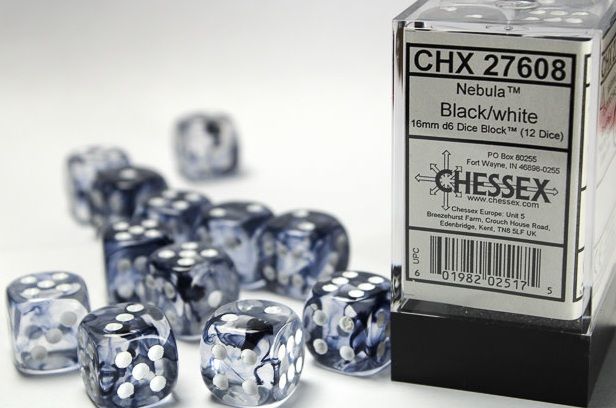• Dados Chessex Nebula 16mm D6 (12 Unidades) Black White | Accessorios | Gameria