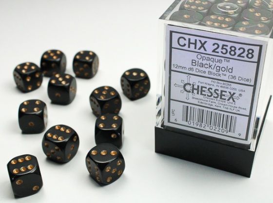 Pack de 36 dados d6 Chessex Opaque de 12mm - Black w/gold. Dados de seis caras con la garantia de calidad de la marca Chessex.