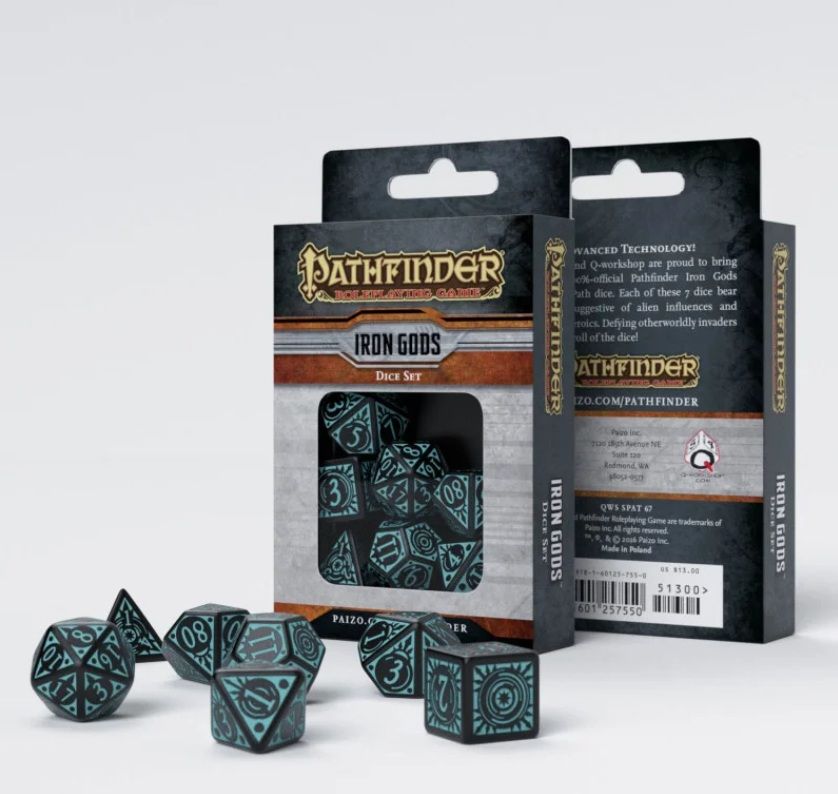 Paizo Inc. y Q-workshop se enorgullecen de presentarte un dado 100 % oficial de Pathfinder Iron Gods Adventure Path. Cada uno de estos 7 dados lleva marcas que sugieren influencias alienígenas y heroísmo de alta tecnología. ¡Desafiar a invasores de otro mundo solo requiere una tirada de dados!