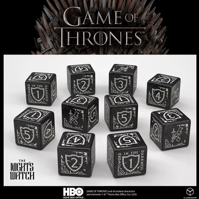 Set 10D6 - Game of Thrones - Guardia de la Noche. 10 dados D6 con temática Guardia de la Noche. Negros con inscripciones gris claro y el lema “Sword in the Darkness”. Alta calidad, ideal para rol y coleccionismo. Venta al por mayor orientada a tiendas de ocio y cultura geek.