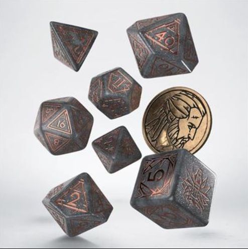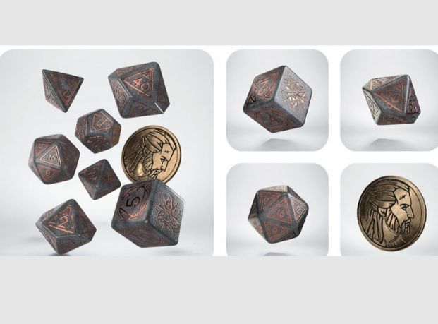 contiene 8 piezas; 7 dados poliédricos y una moneda de metal con la representación de Geralt, que actúa como un D2. Cada dado es de color gris brillante con grabados de color cobre.