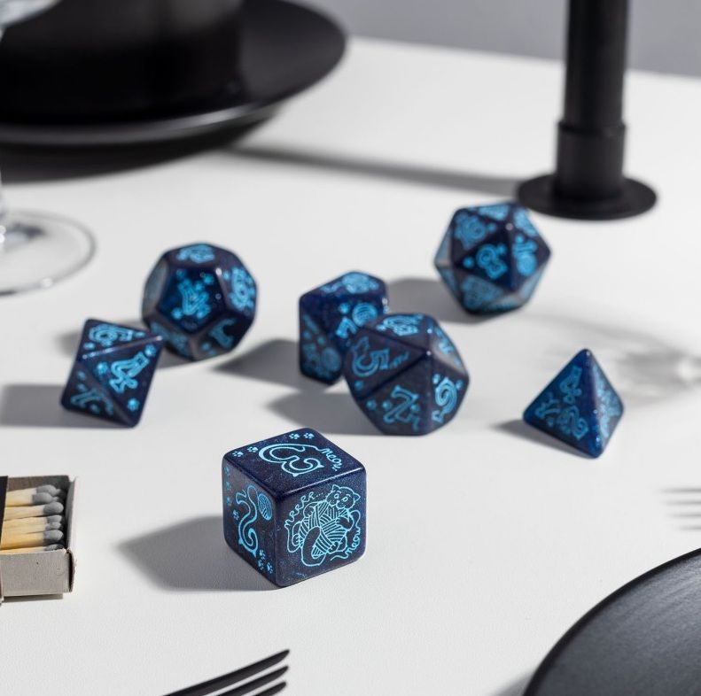 Juego de dados gigantes Cats: River incluye 7 dados de rol más grandes que los estándar, con un clásico dado de 4 caras (D4). La base azul marino brillante y las pinturas azules que brillan en la oscuridad (que se cargan bajo luz ultravioleta para emitir una suave luz azul) resaltan el carácter fluido y nocturno del diseño.