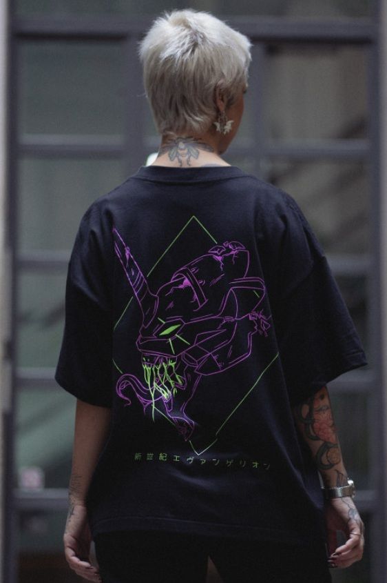 Camiseta negra de Camichan oversize diseño EVA 01 inspirado en el personaje EVA 01 del anime Evangelion. ver menos