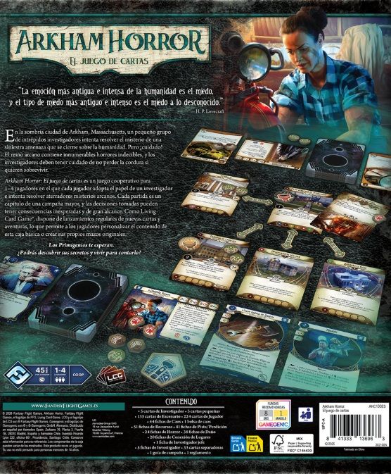 Arkham Horror: El juego de cartas es un juego cooperativo para 1–4 jugadores en el que cada jugador adopta el papel de un investigador e intenta resolver aterradores misterios arcanos. Cada partida es un capítulo de una campaña mayor, y las decisiones tomadas pueden tener consecuencias inesperadas y de gran alcance. Como Living Card Game®, dispone de lanzamientos regulares de nuevas cartas y aventuras, lo que permite a los jugadores personalizar el contenido de esta caja básica o crear sus propios mazos originales.