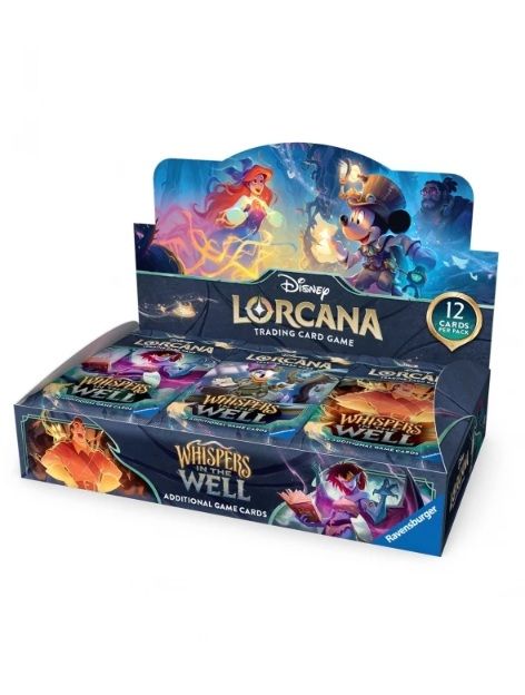 Display con 24 paquetes de refuerzo del set Whispers in the Well de Disney Lorcana TCG. Cada paquete incluye cartas que permiten ampliar, personalizar o construir nuevos mazos, sumando un total de 288 cartas por caja. Ideal para puntos de venta especializados, estos displays ofrecen una experiencia completa para jugadores que buscan mejorar estrategias, descubrir personajes y participar en intercambios.