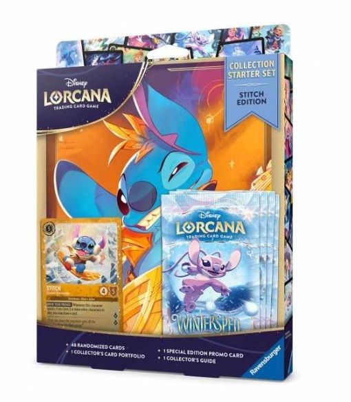 Set de inicio para coleccionistas de Disney Lorcana TCG. Incluye: 4 sobres de refuerzo Winterspell (12 cartas c/u), 1 álbum ilustrado de Stitch, 1 carta promocional foil “Stitch - Carefree Snowboarder” y 1 guía del coleccionista. Perfecto como producto introductorio o regalo.