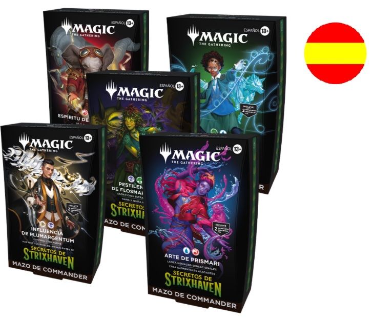 SALIDA DEL PRODCUTO: 24 DE ABRIL DEL 2026. Pack con 5 barajas de commander de la colección Secrets of Strixhaven del juego de cartas Magic the Gathering. Idioma en castellano. ver menos