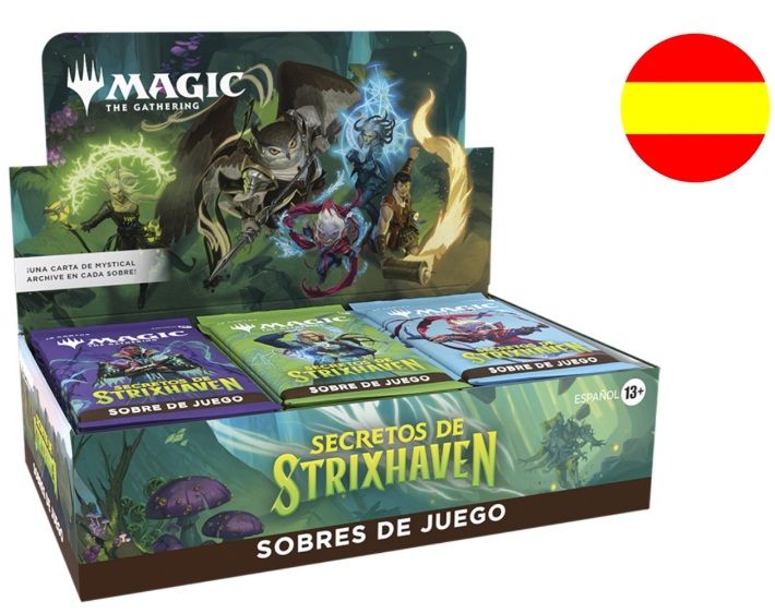 Caja de 30 sobres Play booster de 14 cartas de la expansión Secrets of Strixhaven en castellano.