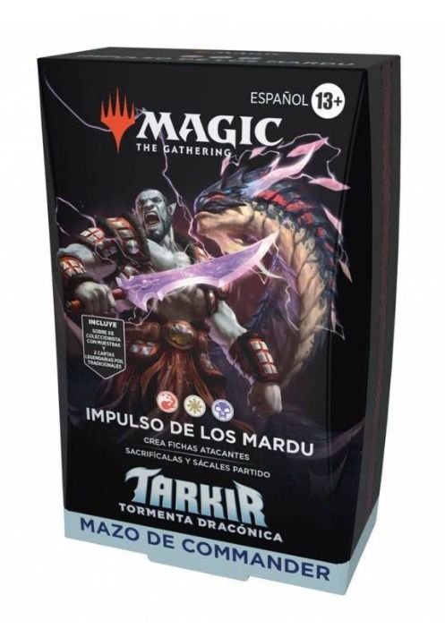 CONTENIDO: 1 mazo Impulso de los Mardu de MTG de Tarkir: tormenta dracónica (100 cartas), un sobre de coleccionista con 2 cartas de muestra, 10 fichas de dos caras y 1 caja guardamazo