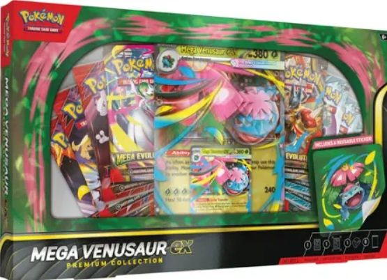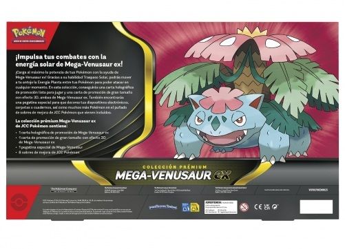 En esta colección, conseguirás una carta holográfica de promoción lista para jugar y una carta de promoción de gran tamaño con efecto 3D, ambas de Mega-Venusaur ex. También encontrarás una pegatina especial para que decores tus dispositivos electrónicos, carpetas o cuadernos, así como muchos más Pokémon en el puñado de sobres de mejora de JCC Pokémon que vienen incluidos.