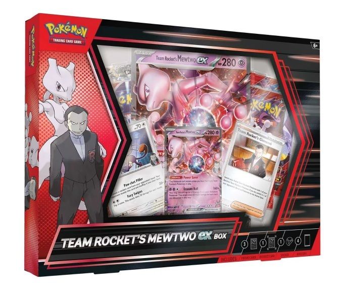 En su búsqueda del poder definitivo y la dominación del mundo, Giovanni y el Team Rocket liberan en combate a un Pokémon aterradoramente fuerte. Cuando el Mewtwo EX del Team Rocket cuenta con el apoyo de otros Pokémon del Team Rocket, su ataque Bola Borradora puede causar hasta 280 de daño de un solo golpe. En esta caja, encontrarás a este poderoso Pokemon ex como carta promocional foil, junto con Meowth del Team Rocket y Giovanni del Team Rocket, además de una pegatina con foto y un puñado de sobres.