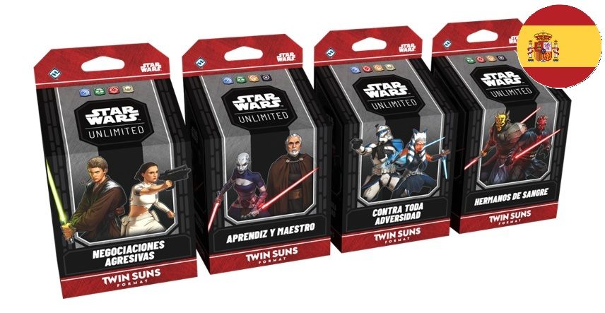 Pack de cuatro mazos Twin Suns (soles gemelos) para el formato de multijugador para Star Wars Unlimited. Idioma en castellano.