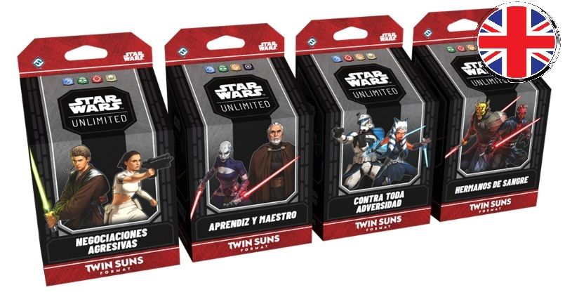 Pack de cuatro mazos Twin Suns (soles gemelos) para el formato de multijugador para Star Wars Unlimited. Idioma en inglés