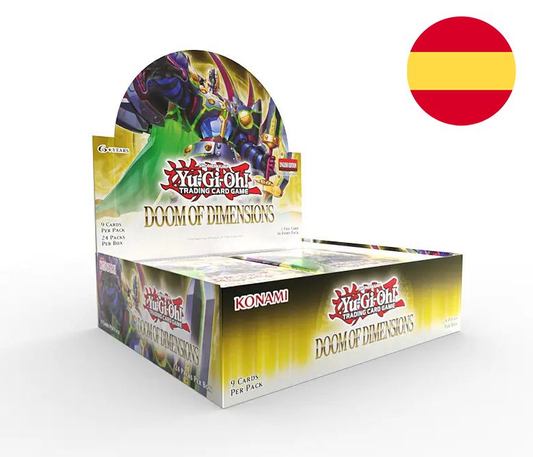 Caja de 24 sobres de la colección Doom of Dimensions del juego de cartas de Yu-Gi-Oh! En español.
