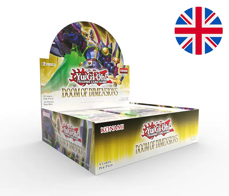Caja de 24 sobres de la colección Doom of Dimensions del juego de cartas de Yu-Gi-Oh! En inglés.