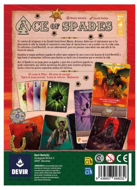 Diseñado por Benjamín Amorín e ilustrado por David Rubín, uno de los artistas más internacionales de nuestro país, Ace of Spades es un juego para un solo jugador, o para dos jugadores si prefieres jugarlo en modo cooperativo, que utiliza mecánicas de póquer para resolver peligrosos duelos contra los peores engendros del Infierno. Ambientado en un salvaje oeste americano con tintes demoníacos, este juego nos propone distintos niveles de dificultad e incluso un conjunto de retos a superar, más allá de ganar la partida.