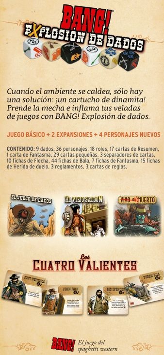 Cuando el ambiente se caldea, sólo hay una solución: ¡un cartucho de dinamita! Prende la mecha e inflama tus veladas de juegos con BANG! Explosión de dados.