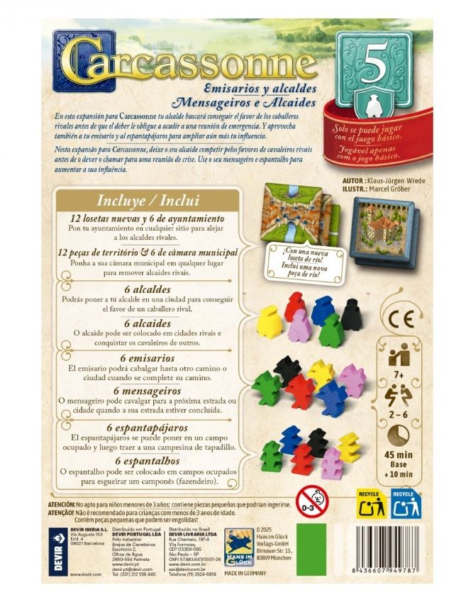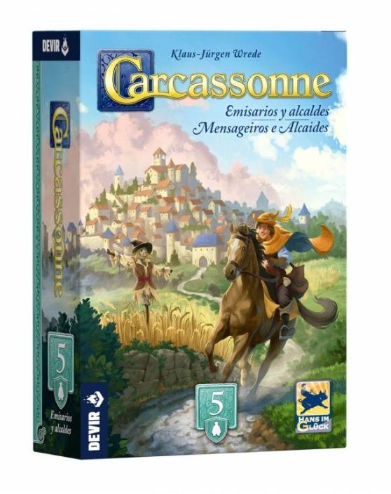 ¡Intriga y política llegan a la ciudadela de Carcassonne! En la caja de Emisarios y Alcaldes encontraréis nuevas losetas de terreno, entre las que destacan las nuevas losetas de Ayuntamiento, que sirven para alejar a los alcaldes rivales.