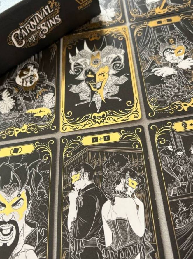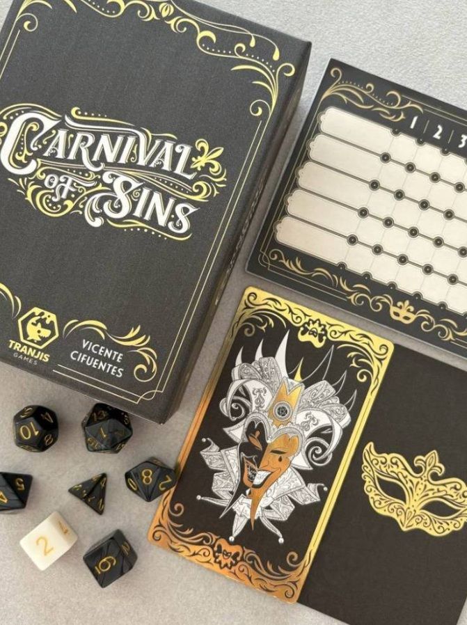 Carnival of Sins es un juego de dados y engaños, de tentación y fortuna, en el que la astucia y la estrategia son tus mejores aliados. El juego dura siete rondas y, al comienzo de cada una de ellas, el jugador que tiene la carta del Diablo tira los dados y, a continuación, cada jugador elige en secreto una de sus siete cartas de pecado para jugar. A continuación, se revelan todas las cartas por orden, lo que activa el efecto de cada pecado para reclamar dados y acumular puntos, mientras se entrometen en los planes de los demás.