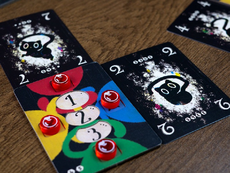 Cat in the Box no es un juego de mesa de bazas cualquiera, ya que anuncias el color de cada carta únicamente al jugarla.