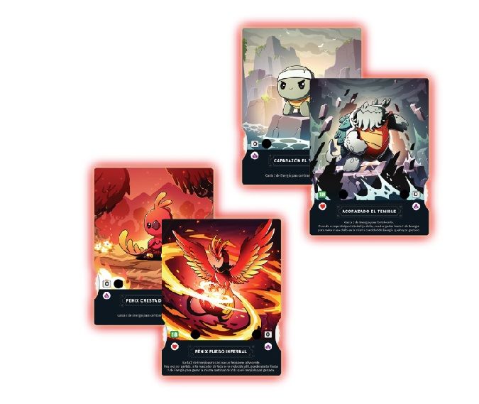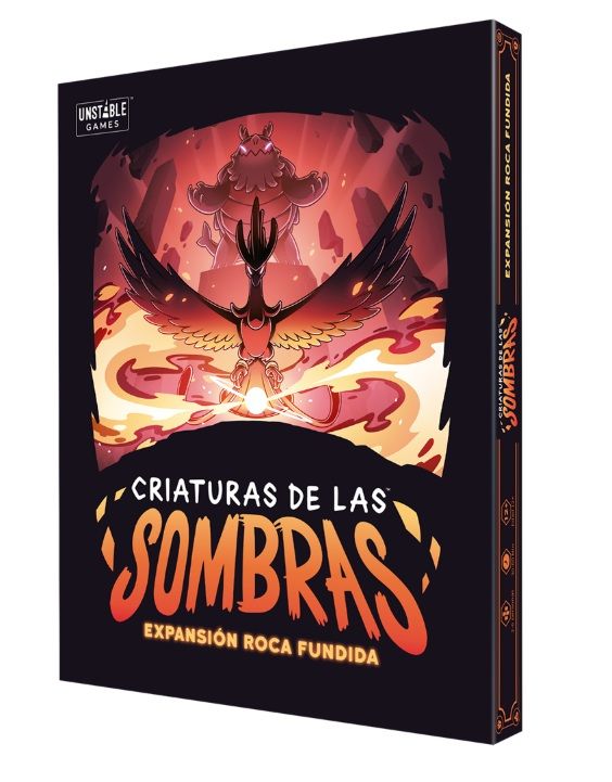 Expansión Roca Fundida del juego Criaturas de las Sombras con tableros de personajes Fénix y Tortuga.