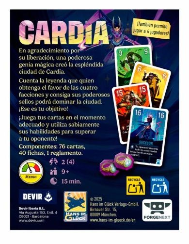 Diseñado por Mathieu Rivero y Faouzi Boughida, Duelo por Cardia es un juego de cartas vibrante y estratégico para dos jugadores (o para 4, jugando con una variante) a partir de 9 años en sesiones rápidas de unos 15 minutos. El primer jugador que obtenga 5 sellos gana el duelo.
