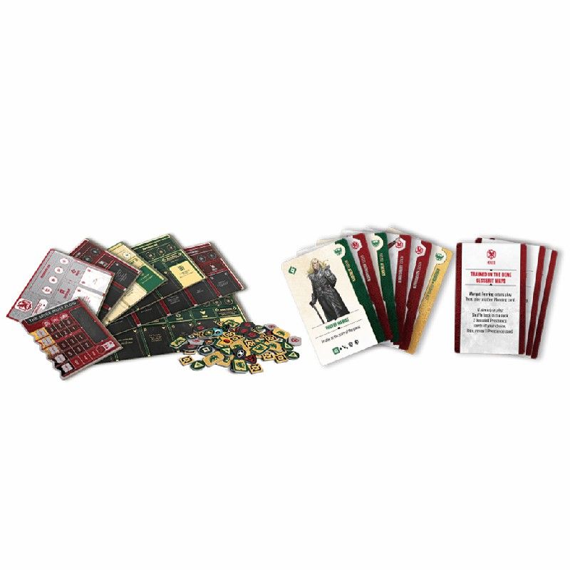 Contenido: 129 miniaturas, 9 bases de plástico, 24 dados, 2 tableros de juego, 7 tableros de jugador, 125 cartas, 86 fichas, 1 reglamento.