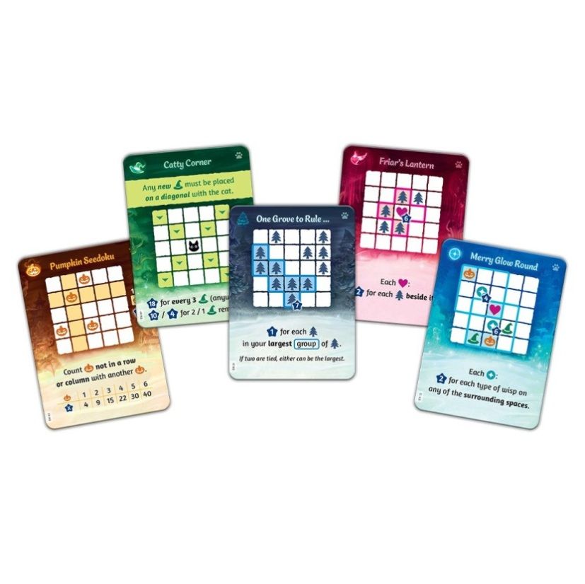 Cada fuego fatuo tiene deseos sobre dónde quiere brillar, ¡e incluso los árboles mágicos tienen preferencias! Tu objetivo será cumplir sus expectativas a lo largo de tres rondas de puntuación. Entre rondas, el bosque cambia, se desvanece y se expande, pero los fuegos fatuos que ya has colocado permanecen, dando forma a las posibilidades futuras.
