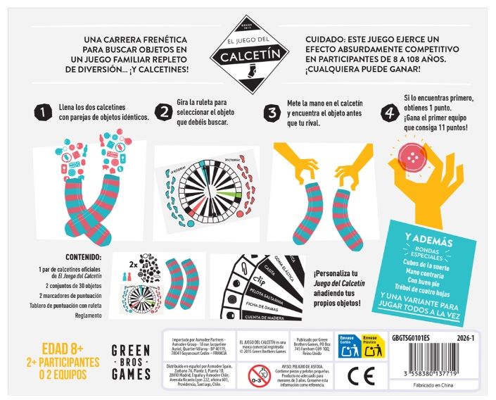 Contenido: 1 par de calcetines oficiales de El Juego del Calcetín, 2 conjuntos de 30 objetos, 2 marcadores de puntuación, Tablero de puntuación con ruleta, reglamento.