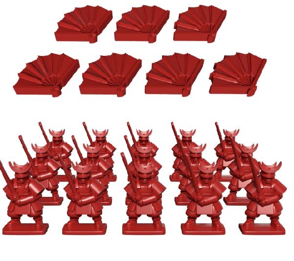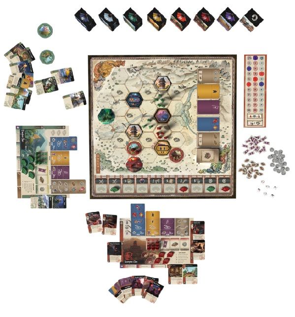 Contenido: 1 tablero principal, 1 tablero de Batalla, 7 tableros de Clan, 90 fichas de Recurso, 12 fichas de Aldea, 6 indicadores de Batalla, 49 indicadores de Logro, 4 piezas de Mejora, 3 piezas de Santuario, 3 piezas de Atalaya, 1 pieza de Toshi Ranbo, 14 piezas de Edificio, 7 piezas de Fuerte, 76 cartas de Orden, 84 cartas de los clanes, 7 cajas de almacenamiento para los clanes, 13 cartas de Táctica neutrales, 1 caja de almacenamiento neutral, 3 cartas de Héroe mercenario, 105 Soldados de los clanes, 24 Héroes con peanas de plástico, 6 dados de batalla personalizados.