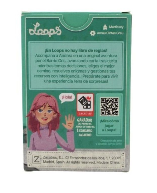 ¡Loops es un juego de mesa sin libro de reglas! Acompaña a Andrea en una original aventura por el Barrio Gris, avanzando carta tras carta mientras tomas decisiones, eliges el mejor camino, resuelves enigmas y gestionas tus recursos con inteligencia.