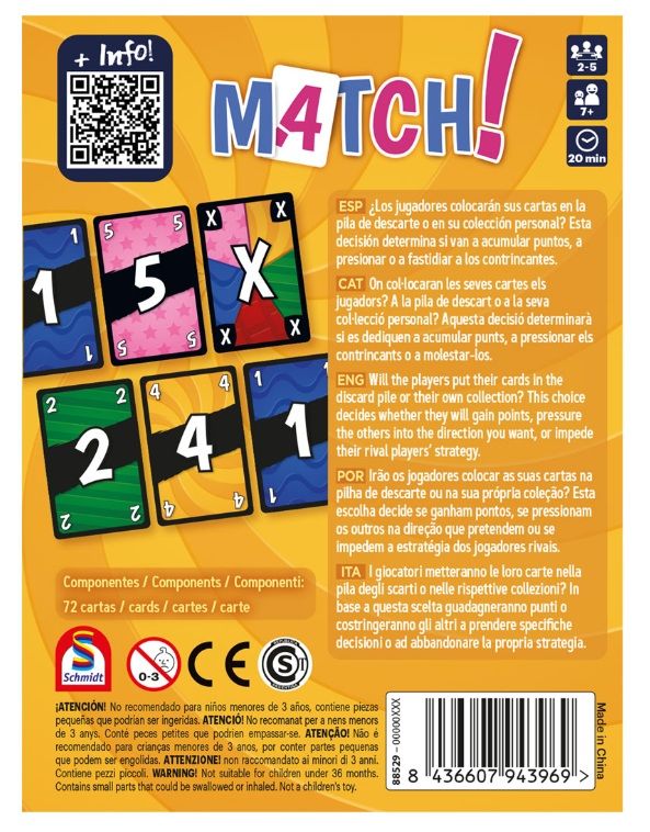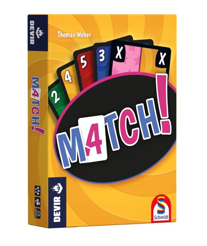 Obra de Thomas Weber, Match! se puede jugar en pareja o en grupos de hasta 6 jugadores, a partir de 8 años, en partidas de unos 20 minutos de duración. El objetivo del juego consiste en acumular puntos ronda tras ronda hasta alcanzar los 50. Con mecánicas de emparejamiento que recuerdan a los clásicos juegos de cartas de colores y números, este juego promete horas de diversión.