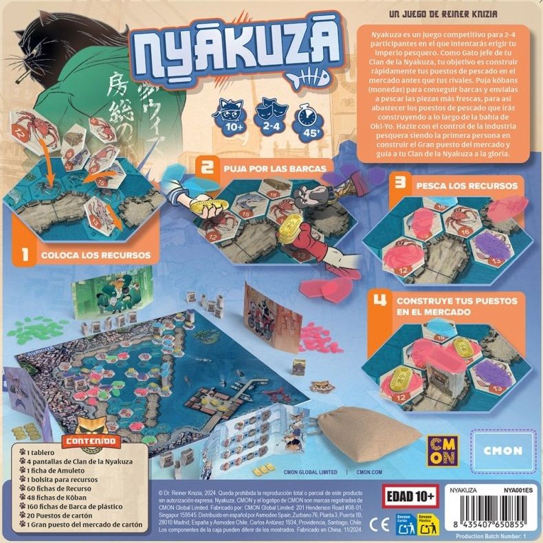 Como Gato jefe de tu Clan de la Nyakuza, tu objetivo es construir rápidamente tus puestos de pescado en el mercado antes que tus rivales. Puja kōbans (monedas) para conseguir barcas y envíalas a pescar las piezas más frescas, para así abastecer los puestos de pescado que irás construyendo a lo largo de la bahía de Oki-Yo. Hazte con el control de la industria pesquera siendo la primera persona en construir el Gran puesto del mercado y guía a tu Clan de la Nyakuza a la gloria.