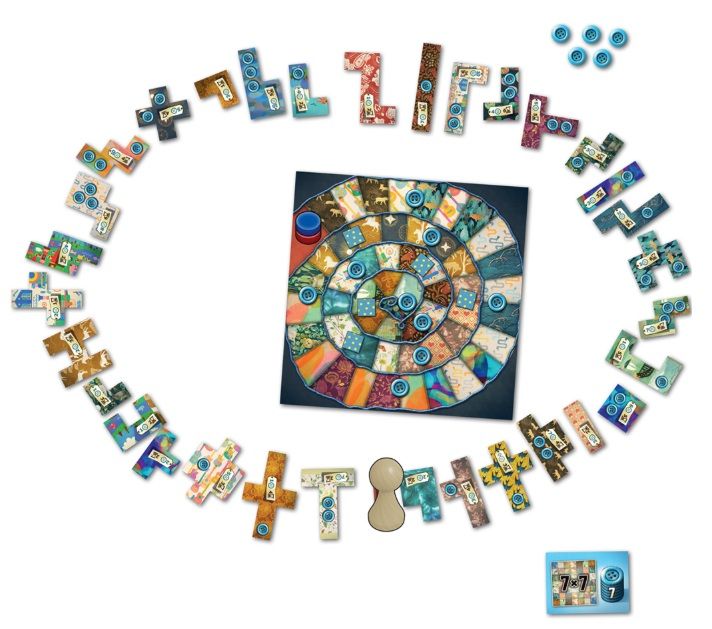 Contenido: 1 tablero central, 2 tableros-colcha, 1 peón, 33 parches, 5 parches de cuero, 1 loseta de bonus 7×7, 50 fichas de botón, 1 reglamento