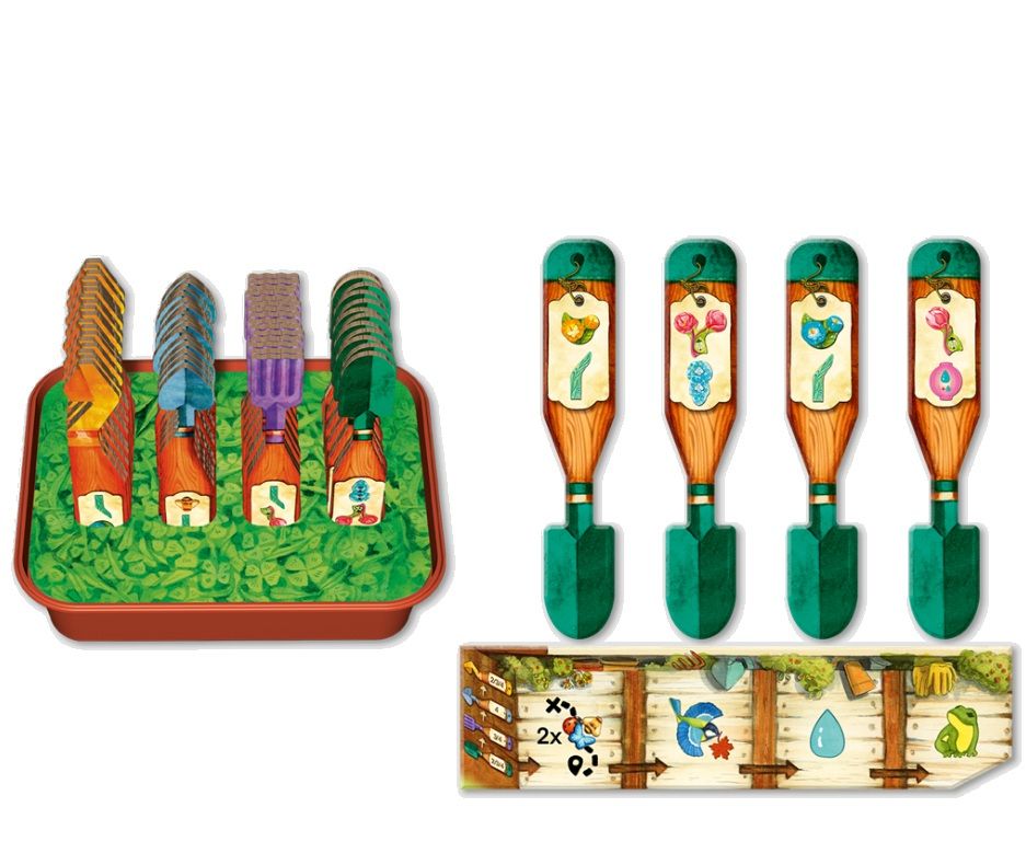Contenido: Tablero de acciones, 4 tableros de jardín, 4 tableros de pérgola, 4 tableros de cascada, 4 tableros de puntuación, tablero de hojas, tablero de Estanque, 63 Herramientas, 107 fichas de Planta, 30 Mariposas, 30 Mariquitas, 40 Abejas, 21 Libélulas, 30 Hojas, 16 Farolillos, 16 Tarros de miel, 4 Casetas de pájaro, 4 macetas de participante, portaherramientas, bandeja de fichas, 8 Gotas de agua, 4 Ranas, bloc de puntuación, reglamento