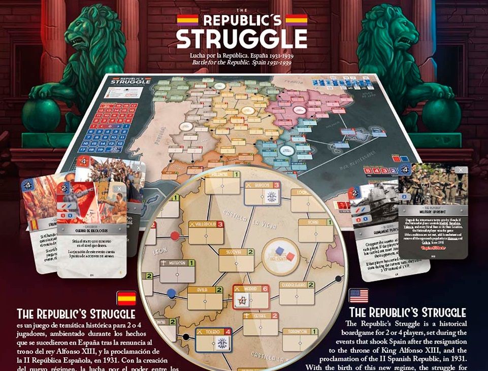 Republic Struggle es un juego temático con motor de cartas para 2 jugadores, ambientado durante los hechos históricos que se sucedieron en España tras la renuncia al trono del rey Alfonso XIII, y la proclamación de la II República Española, en 1931. Con la creación del nuevo régimen, la lucha por el poder entre los distintos sectores sociales, políticos, e ideológicos se acrecentó, lo que dio lugar a continuos cambios de poder político, alteraciones del orden público, levantamientos armados y actos violentos, protagonizados por las numerosas facciones ideológicas del momento; que culminaron en 1936, en una fallida sublevación militar. El fracaso de este golpe de estado originó la Guerra Civil Española.