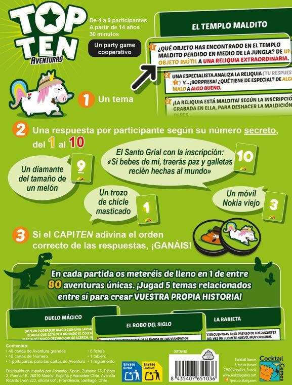 Contenido: 40 cartas de Aventura grandes, 1 portacartas para las cartas de Aventura, 8 fichas, 10 cartas de Número, 1 tablero, 1 reglamento.