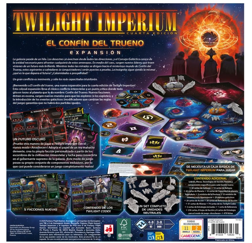 Esta colosal expansión lleva el clásico conflicto interestelar a un punto crítico donde todo gira en torno al planeta que le da nombre: Confín del Trueno. Nuevas facciones entran en escena, surgen nuevos mundos para que los explores (o los explotes), y la introducción de los eventos galácticos (modificadores que cambian las reglas del juego) garantiza que no habrá dos partidas iguales.