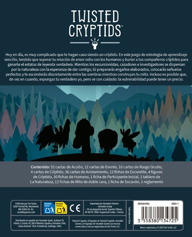 Twisted Cryptids es un juego de mesa en el que, como ser legendario, tendrás que superar tu relación de amor-odio con los humanos y burlar a tus compañeros críptidos para ganarte el estatus de leyenda. Mientras los excursionistas, cazadores e investigadores se tienen la esperanza de dar contigo, tú prepararás engaños, colocarás señuelos y te esconderás entre las sombras mientras construyes tu mito.