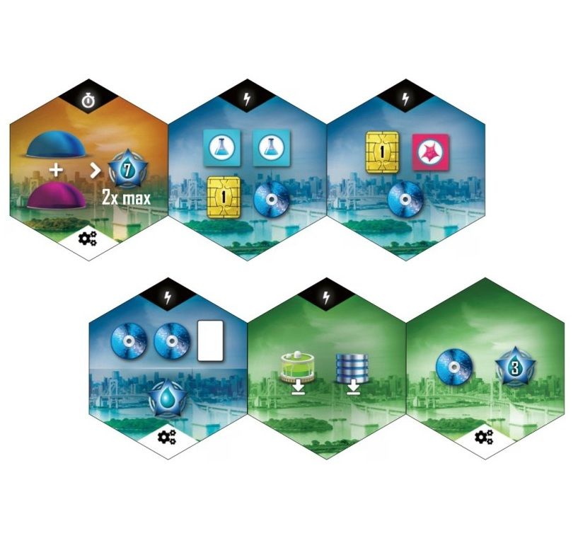 Junto a las nuevas cúpulas, un nuevo edificio, los servidores, que producen un nuevo recurso, los discos de datos. Estos podrán usarse durante nuestro turno para realizar una acción extra, cómo cambiar un recurso por otro, robar cartas e incluso jugar una carta extra.  Además las cúpulas azules proporcionan muchos puntos cada era si conseguimos construir conjuntos de los cuatro edificios de producción junto a nuestras cúpulas.