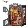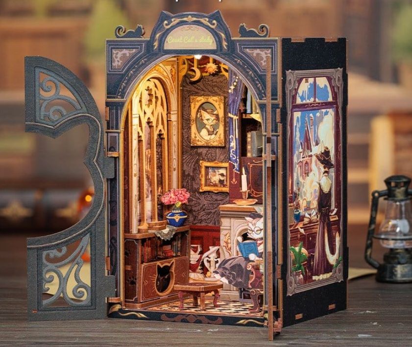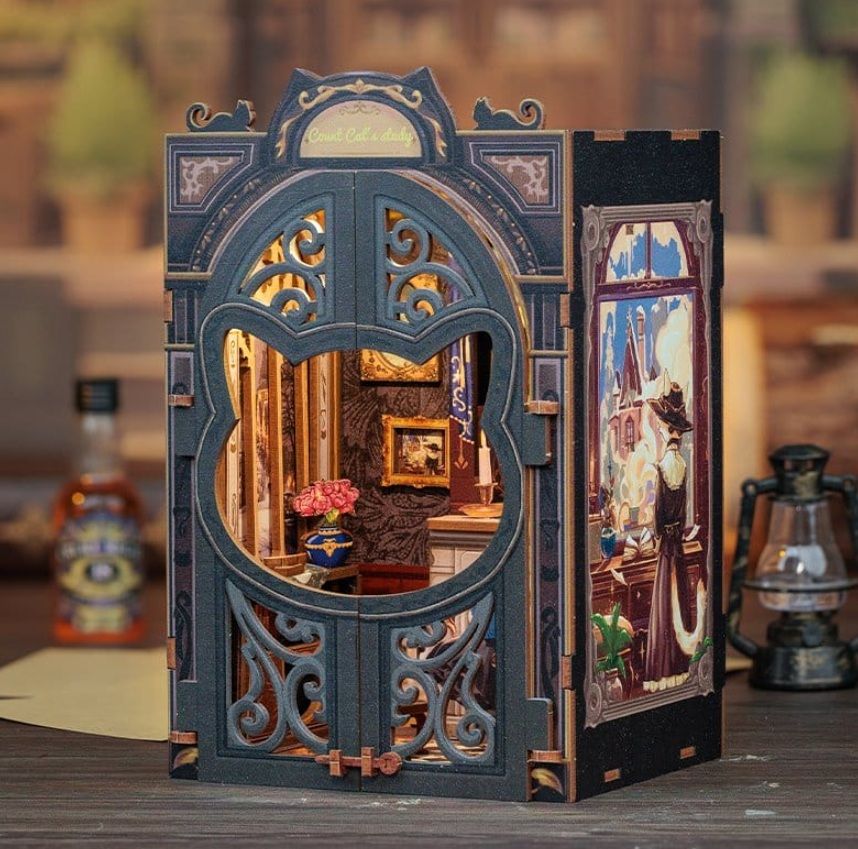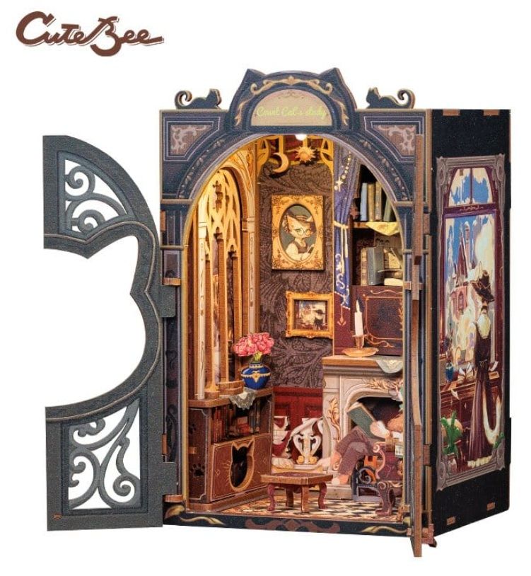La maqueta Book Nook Count Cat’s Study es un kit de construcción en miniatura (diorama) de la marca CUTEBEE que recrea un estudio clásico habitado por gatos eruditos. Está diseñado como un rompecabezas de madera en 3D para insertarse entre los libros de una estantería, creando una "ventana" a un mundo mágico.
